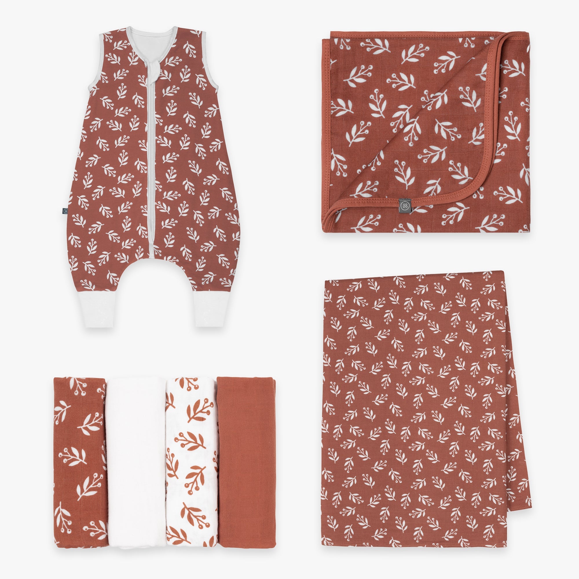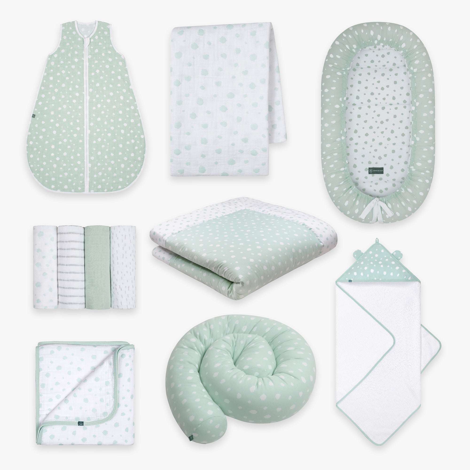 Dieses Set ist perfekt für alle Eltern geeignet, die noch auf der Suche nach der perfekten Erstausstattung sind. Neben Möbeln und Kleidung sind das die absoluten Baby Must-Haves. Von Krabbeldecken, über Babyschlafsäcke bis hin zu Spucktüchern – alles ist dabei!