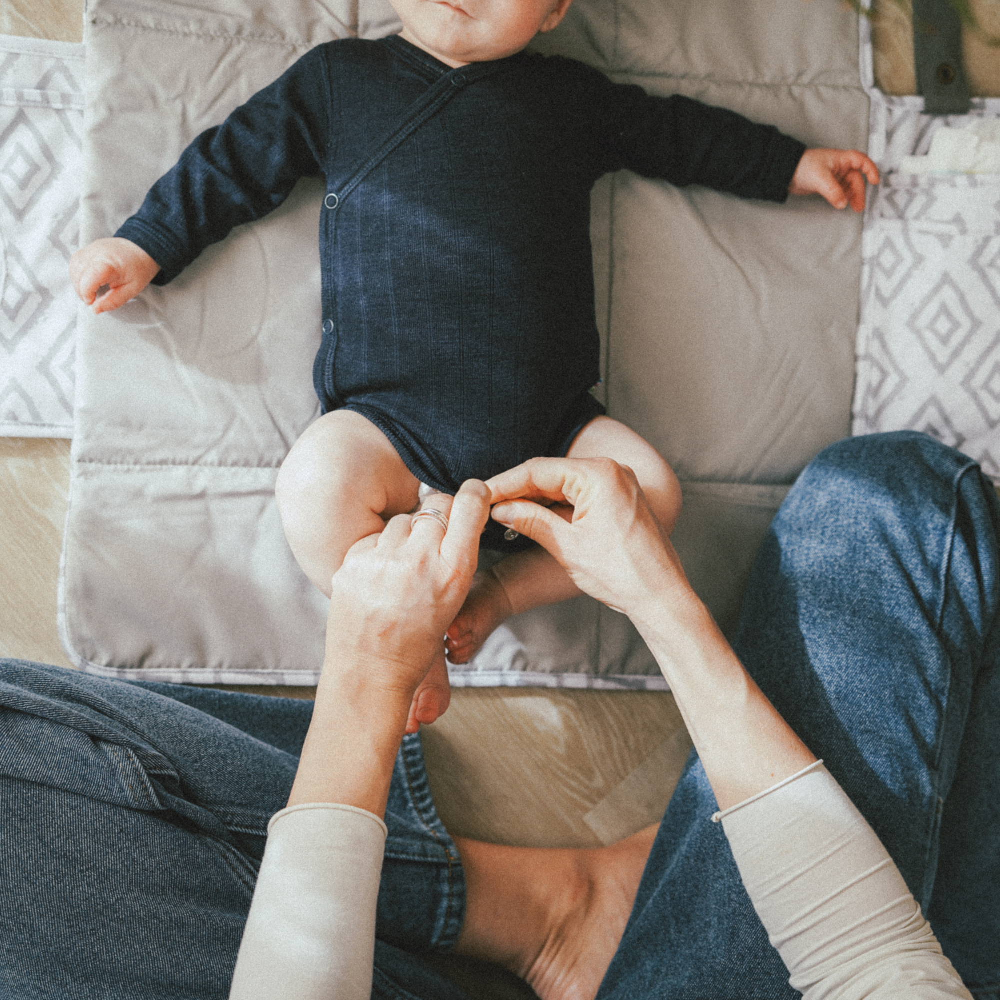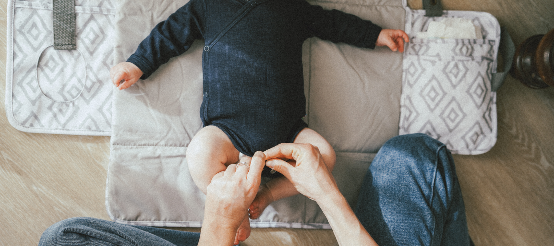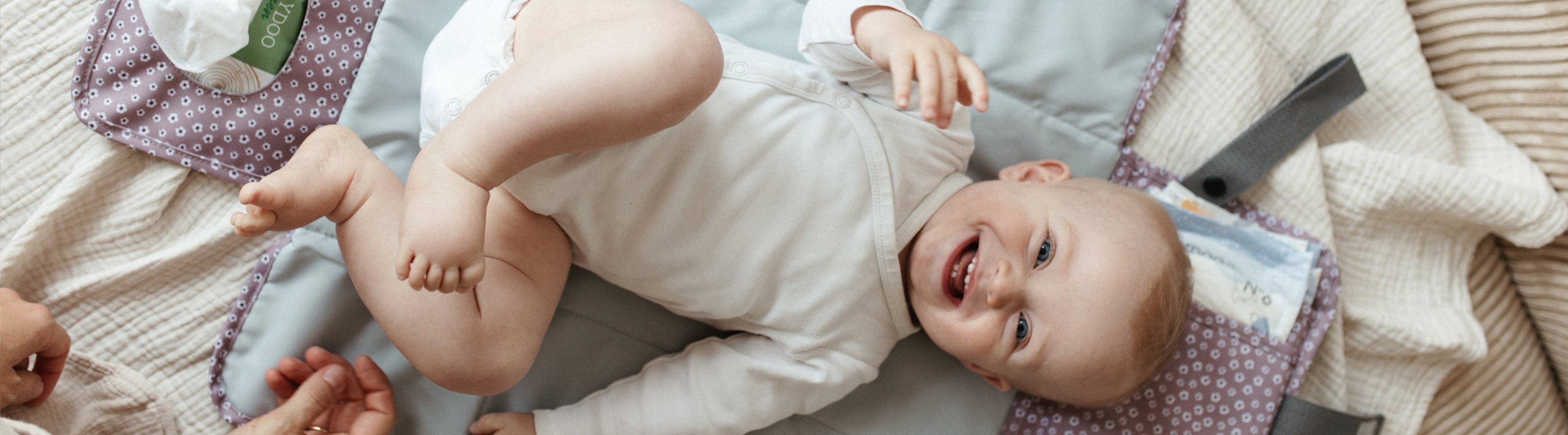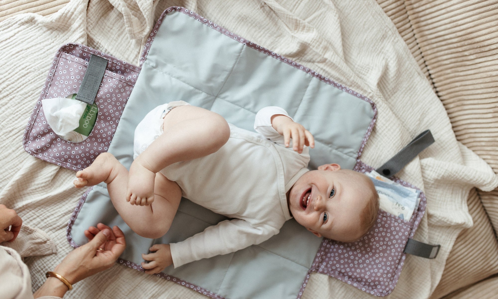 Es ist immer praktisch, wenn Du die Feuchttücher dort hast, wo Du sie benötigst - am Popo Deines Babys. Platziere die Wickelunterlage also so, dass die Feuchttücher in Deine Richtung zeigen. So hat Dein Baby genügend Platz auf der Wickelunterlage.