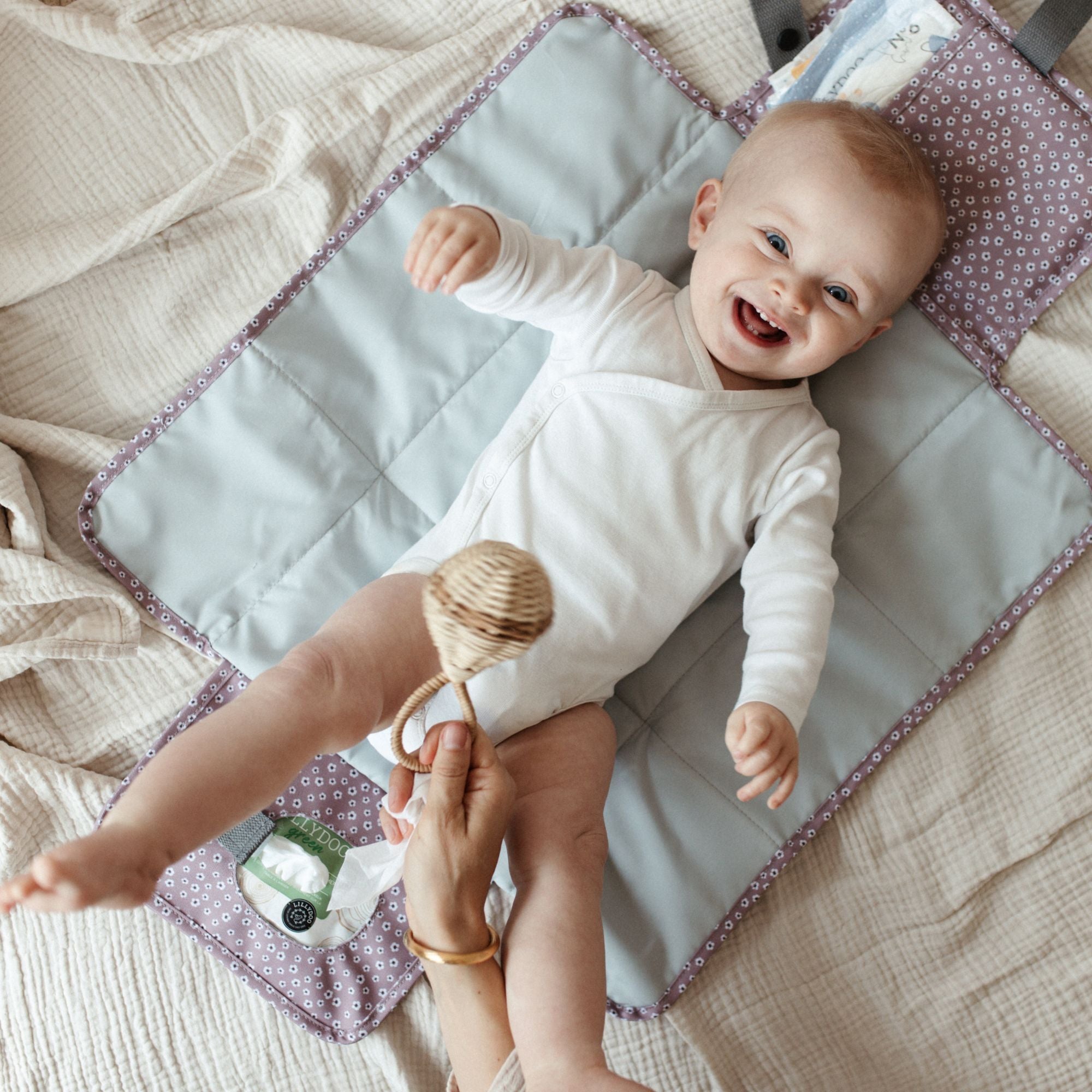 Unsere mobile Wickelunterlage lässt sich ganz bequem überall mit hinnehmen. Sie ist kompakt und bietet gleichzeitig ausreichend Stauraum für alles, was Du für das Wickeln unterwegs benötigst: Wndeln, Feuchttücher und Pflegeprodukte. Dank der praktischen Schlaufe kannst Du sie im Handumdrehen am Kinderwagen oder an Deinem Handgelenk befestigen. So ist sie jederzeit griffbereit, wenn Du sie benötigst.