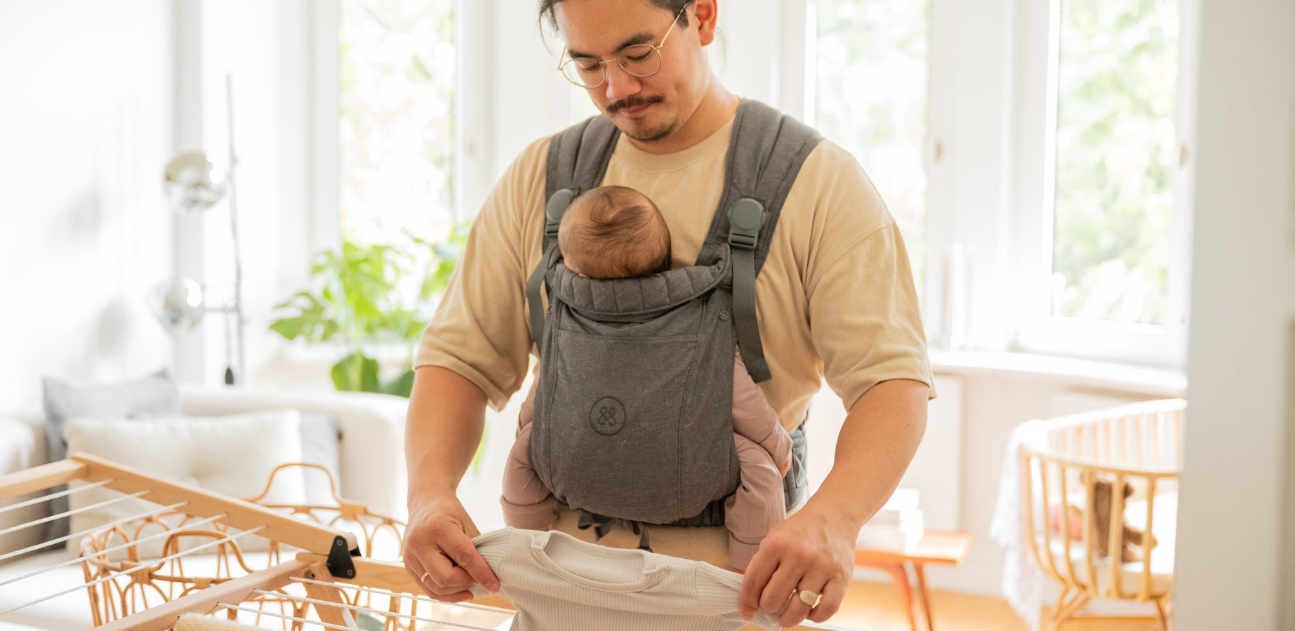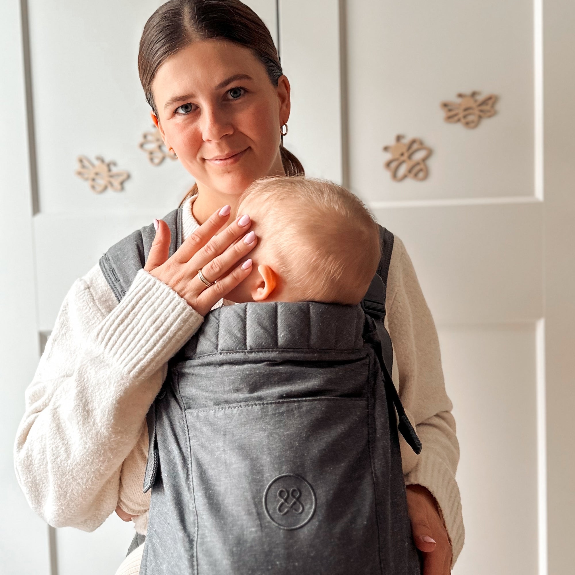 Lege die Trage zuerst an, setze Dein Baby hinein und schließe sie mit einem Handgriff. Einfach und schnell - perfekt für Erst-Eltern oder alle, die Alltagserleichterung suchen.