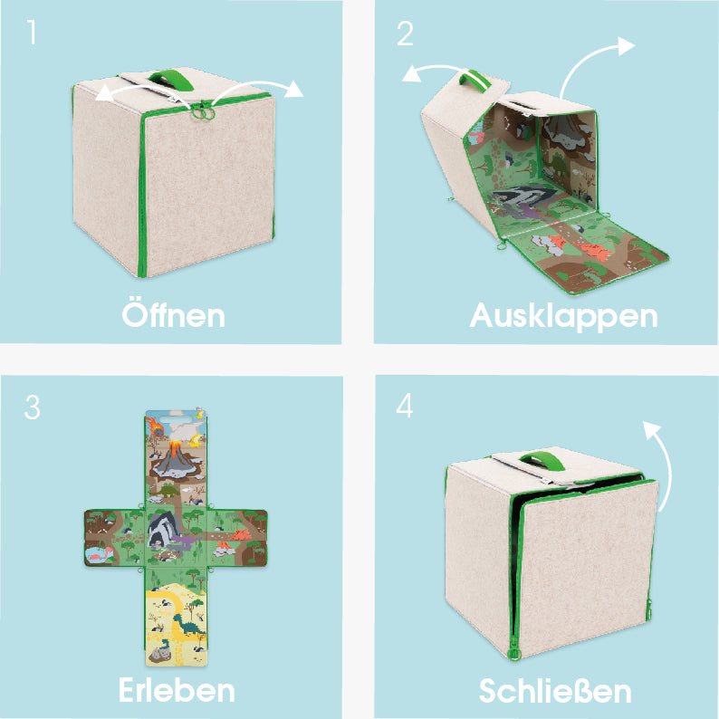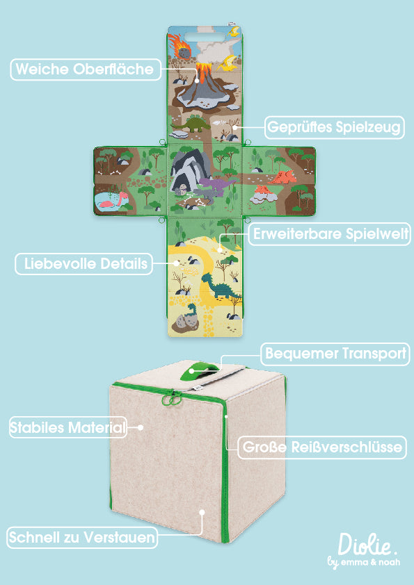 Das Besondere an Diolie ist, dass der Würfel Spielteppich und Aufbewahrungsbox in einem ist. Durch die Reißverschlüsse kann er im Nu zu einem Spielteppich ausgeklappt werden und genauso einfach wieder zu einer Aufbewahrungsbox umgewandelt werden, die perfekt in jedes Regal passt. Alle Spielfiguren, Spielsteine und Autos finden Platz im Diolie. Dank des Tragegriffes an der Oberseite kann Diolie außerdem bequem transportiert werden – egal ob in den Urlaub oder zu Oma und Opa. Diolie ist immer dabei!