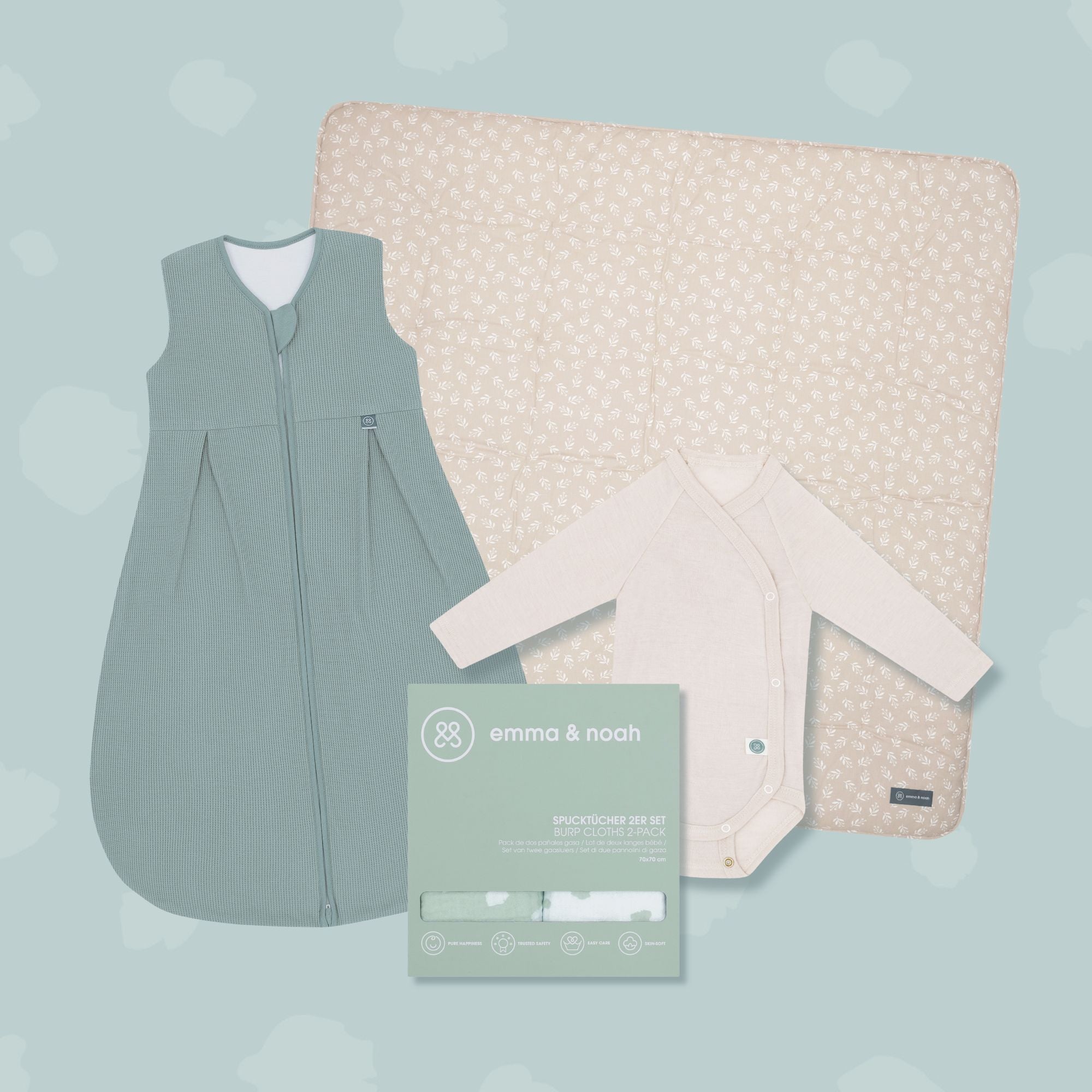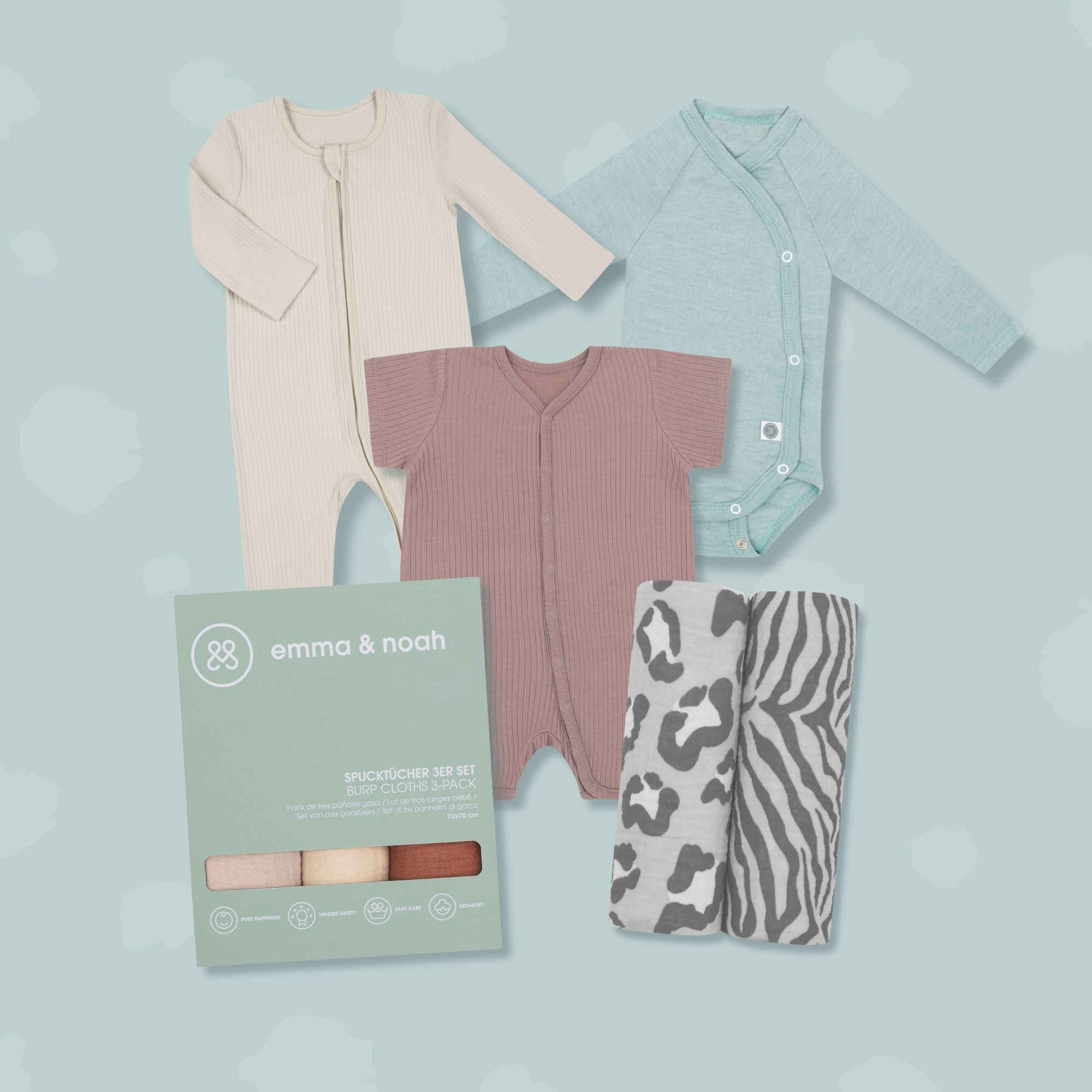 Im Babyalltag kann schnell mal ein kleines Missgeschick passieren. Damit Du immer gut vorbereitet bist, solltest Du ausreichend Spucktücher und Bodys/Strampler griffbereit haben. Du wirst sehen: Davon kann man nie genug haben!